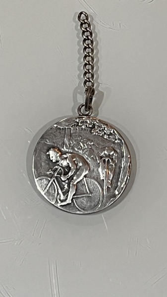 • ANTIGA MEDALHA DE CICLISMO, PROVAVELMENTE DÉCADA DE 1920 ART NOUVEAU, CONFECCIONADA  EM PRATA DE LEI 800. PEÇA ASSINADA.
