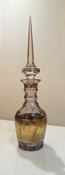 • Garrafa em cristal artístico atribuída à Moser, de refinado padrão europeu, possivelmente datada do início a meados do século XX. Apresenta corpo bojudo em cristal translúcido com elegante tonalidade âmbar dourada, base facetada em delicado tom lilás/ametista, criando contraste sofisticado e efeito luminoso. Gargalo trabalhado com anéis e relevos lapidados, demonstrando apuro técnico e excelente acabamento. Rolha original em cristal maciço, alta e pontiaguda em formato de obelisco, harmonizando com o conjunto. Mede aproximadamente 55 cm de altura com a tampa. Apresenta pequeno lascado na parte interna da tampa, imperceptível quando encaixada e que não interfere no uso nem na estética da peça. Peça de presença marcante, com brilho intenso e lapidação precisa, ideal para coleção, decoração ou composição de mesa refinada.