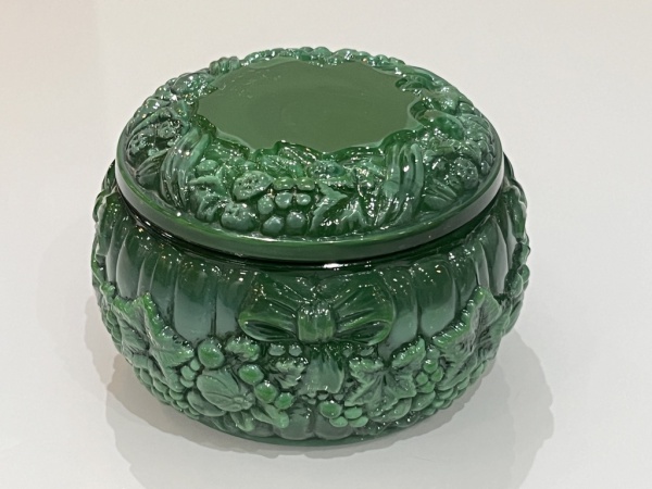 • Caixa Decorativa em Pasta de Vidro Verde com Tampa  Estilo MalaquitaElegante caixa decorativa em vidro verde translúcido, com rica ornamentação em relevo. A peça apresenta decoração em guirlandas florais e laços em alto-relevo que contornam toda a circunferência, conferindo charme e sofisticação ao conjunto.Com tampa ajustada e interior liso, é ideal para guardar pequenas joias, objetos delicados ou simplesmente compor a decoração de aparadores, penteadeiras e cristaleiras.A tonalidade verde intensa remete visualmente à malaquita, proporcionando um efeito nobre e marcante, embora não se trate de pedra natural.Peça decorativa de grande presença estética, perfeita para colecionadores ou apreciadores de objetos diferenciados.Estado de conservação: bom, sem quebras aparentes.Dimensões? 7 cm. de altura e 8 cm. de diâmetro.