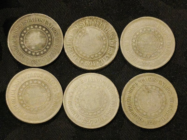 • LOTE DE MOEDAS DE 200 REIS, ANOS 1893 - 1894 - 1895 - 1896 - 1897 E 1898, PEÇA ORIGINAL APRESENTANDO PÁTINA NATURAL DO TEMPO E EVENTUAIS MARCAS DE MANUSEIO HUMANO. TRATA-SE DE MOEDAS AUTÊNTICAS, PRESERVADAS EM SUAS CARACTERÍSTICAS ORIGINAIS. TODOS OS ITENS CONSTANTES NO CATÁLOGO DESSE LEILÃO, SÃO VENDIDOS COMO DESCRITOS E MOSTRADOS NAS FOTOS. CASO AINDA HAJA ALGUMA DÚVIDA, É IMPORTANTE ESCLARECER ANTES DO DIA DO LEILÃO.