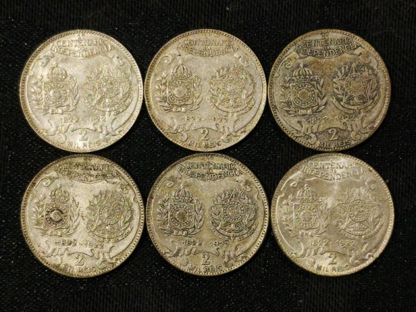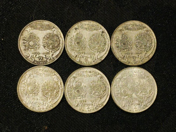 • PRATA - LOTE 6 MOEDAS 2000 REIS - ANO 1922.MOEDAS BEM CONSERVADAS, PORÉM PODEM APRESENTAR PÁTINA NATURAL DO TEMPO, E EVENTUAIS MARCAS DE MANUSEIO HUMANO. TRATA-SE DE MODEDAS AUTÊNTICAS.TODOS OS ITENS CONSTANTES NESSE LEILÃO, SÃO VENDIDOS COMO DESCRITOS E MOSTRADOS NAS FOTOS. SE AINDA HOUVER DÚVIDAS, ESCLARECER ANTES DO LEILÃO.